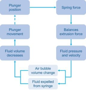 The model behind the software uses a time-stepped approach to break down an injection into discrete, calculable steps. Each loop begins with a known plunger position, which relates to the device’s spring length. From this the spring force is known and is assumed approximately equal to the current extrusion force.