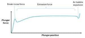 The force-distance chart created in a BLEF test shows useful information: the initial break-loose force of the stationary plunger; the extrusion force (which comprises of dynamic plunger-syringe friction, and the drug formulation’s back pressure); and a small dip in force indicative of an air bubble expelled after drug delivery.