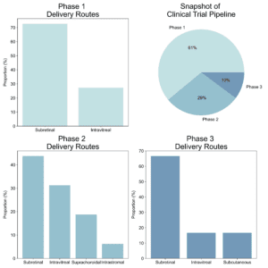 Figure 1: Snapshot of clinical trial pipeline. Subretinal injections are currently the primary delivery mode across all clinical phases, with intravitreal secondary. Recent years have seen a growth of a new method using the suprachoroidal space.