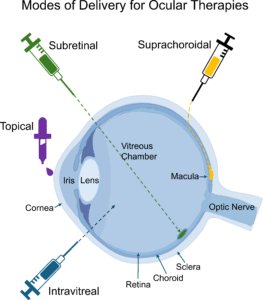 Figure 2: Key parts of the eye and the modes of delivery for in vivo ophthalmic therapies.