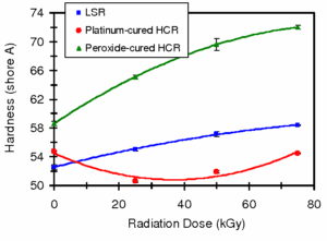 Figure 1: Effect of gamma radiation on durometer hardness of silicone rubbers.(7)