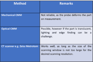 Manufacturers only familiar with mechanical probe-based co-ordinate measuring machines (CMMs) may also struggle to measure the part. A brief summary of measurement methods for LSR can be found in Table 1.