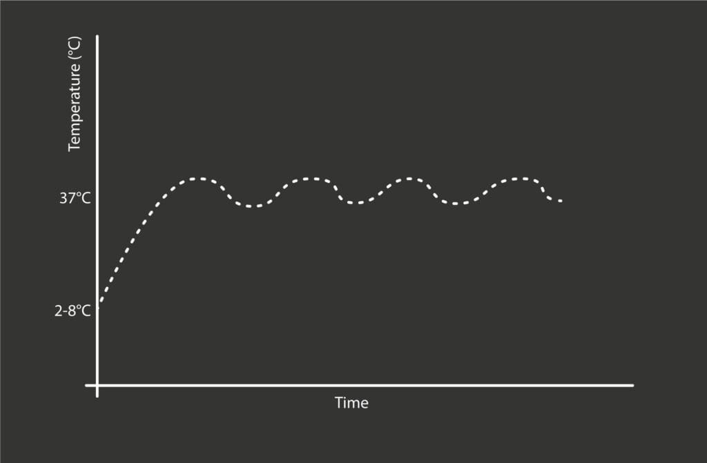 In this way, the temperature of the drug is controlled (Figure 7) without the need for sensing or actuating electronics, which would complicate device development and raise the cost of the product.