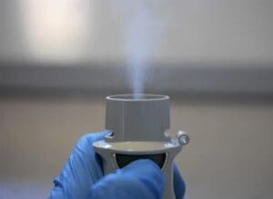 SMIs generally work by forcing liquid through a small nozzle to generate a fine aerosol mist, although different mechanisms have been explored, including impinging jets (Respimat – mist shown in Figure 3) and Rayleigh break-up (Medspray). A spring or other mechanical system is used to generate the required pressure instead of any form of propellant, therefore also removing the issue of emissions from use.