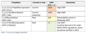 Researchers and pharmaceutical companies are already actively searching for alternative propellants to replace the current options. The table below summarises some of the main lower GWP candidates currently being considered compared to some which are currently in use.6